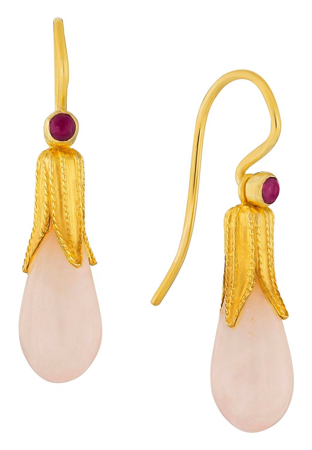 Rose quartz is said to encourage the expression for emotions, so save these for your closest tete-a-tetes. 24k gold over sterling silver; garnet accented hoop backs. Size:1 1/8 Inch.