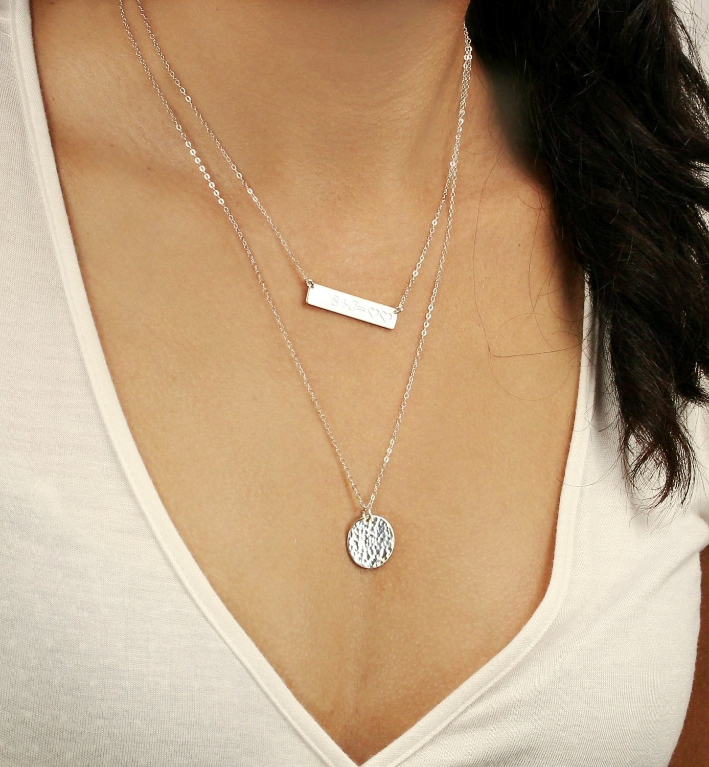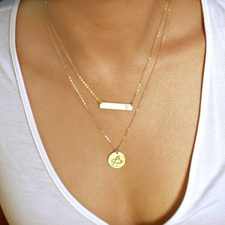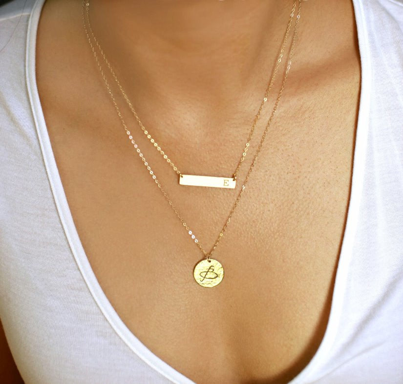 Delicate 14K Gold Fill, Sterling Silver, or Rose Gold Fill Layered Necklace Set of 2. Personalized large disc necklace with an initial, symbol or leave it blank with any available finish. Save when buying this layering necklaces set of 2. It is a personalized bar necklace that makes a cute necklace for a girlfriend or a cute necklace for her. If you’re looking for what to get for mother’s day get this. It can be a mother’s day gift for grandma or a Mother’s day gift DIY.