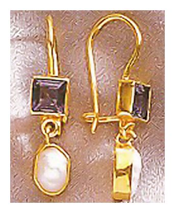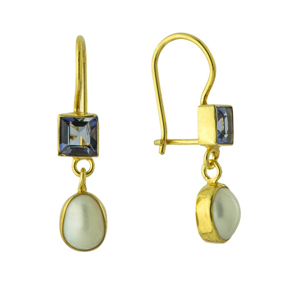 Had you attended the opening of the first roller skating rink in London in 1875, you might have skated in fashionable Iolite and Pearl earrings such as these, 24k gold over sterling silver; hinged backs. Size: 1 1/8 Inches.
